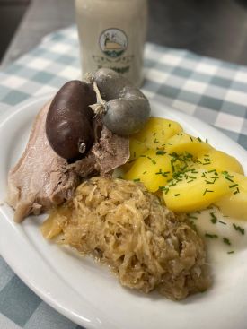 Schlachtschüssel mit Salzkartoffeln und Sauerkraut und auch Blut- und Leberwurst mit Salzkartoffeln und Sauerkraut